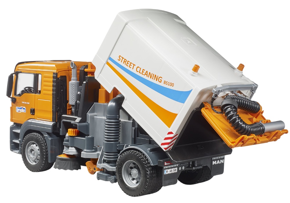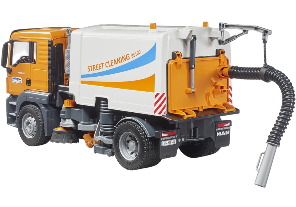 Camión MAN TGS de limpieza de calles, muestra con gran detalle la funcionalidad. De construcción robusta, equipado con motores de gran potencia de hasta 500 CV y con una carga útil superior a la media.