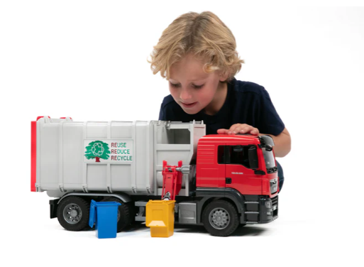 El camión MAN TGS es el todoterreno ideal para obras, transporte de larga distancia y distribución a corta distancia. De construcción robusta, equipado con motores de gran potencia y con una carga útil superior a la media, este camión es el prototipo del vehículo «puedelotodo» del que tanto se habla y que incorpora gran cantidad de innovaciones. Siendo una novedad en la flota de camiones MAN TGS de BRUDER destaca como camión de basura moderno con cargador lateral. Un mecanismo elevador desplegable lateralmente agarra los contenedores de basura y los vacía sin ayuda de una segunda persona, dos tornillos sin fin desplazan hacia atrás la basura depositada en el interior del compartimento de carga. Tras la apertura del portón trasero, la estructura bascula para vaciar la carga. Con este juguete rico de gran fidelidad de detalles se puede jugar con gran realismo en torno al interesante tema de la eliminación de residuos como dice el lema: ¡Igual que en la vida real!