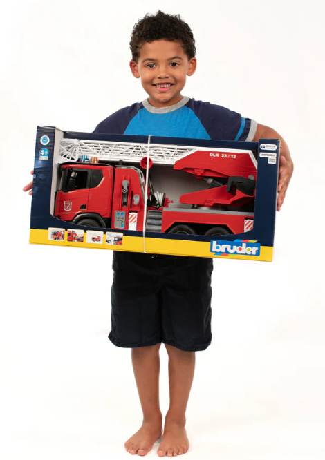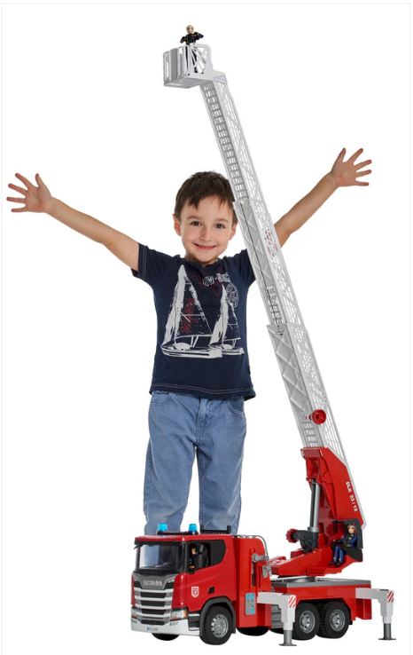 El producto estrella con temática de bomberos de la gama BRUDER es el camión de bomberos con escalera Scania Super 560R, el vehículo dispone de un depósito de agua integrado que se puede llenar mientras se juega. La manguera de agua es desenrollable y la pueden sujetar las figuras de BRUDER. También se puede sujetar al cesto de la escalera y tiene una boquilla de agua completamente funcional. La escalera giratoria con cesto de salvamento se puede desplegar y regular en altura mediante un volante. Además de los dos asientos de la cabina del conductor hay otro asiento adicional para la figura de bworld en la escalera de bomberos. Los cuatro pies de apoyo garantizan una fijación segura del vehículo en cualquier situación y el compartimento con puerta abatible crea espacio adicional para guardar herramientas. El módulo de luces y sonido contiene funciones distintas como ruido de motores, luz intermitente y ruido de sirenas se incluye en el volumen de suministro y aumenta más la diversión de este lujoso camión de bomberos.