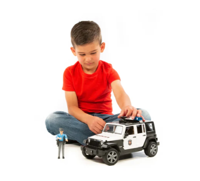 El Jeep Wrangler Unlimited Rubicon está diseñado para el servicio diario con un atrayente look policial e incorpora numerosas funciones que aseguran una diversión prácticamente ilimitada al jugar con él. Además del techo de segmentos extraíble de 2 piezas, es posible abrir el capó del motor, la puerta trasera y las otras cuatro puertas. Por supuesto, hay espacio disponible en el vehículo para que cuatro figuras bworld de BRUDER viajen juntas.