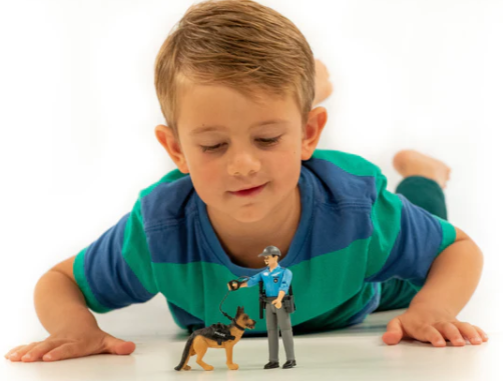 BRUDER da la bienvenida al policía bworld con perro, los miembros más recientes de su escuadrón. El policía lleva su perro con seguridad gracias a la correa y al arnés. El policía bworld tiene todo el equipamiento que necesita para estar listo para la acción. En el cinturón donde lleva su pistola tiene también una linterna, una radio y una porra como equipamiento importante para su misión.