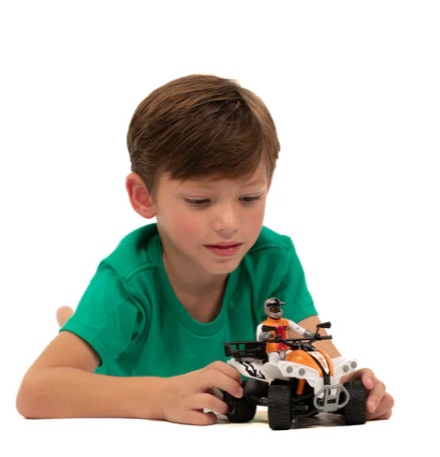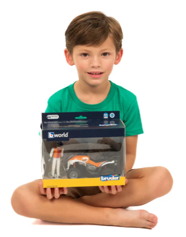 El quad BRUDER impresiona por su diseño visualmente moderno y de alta calidad, gracias a la suspensión en ambos ejes y a la maniobrabilidad del eje delantero, el quad es muy maniobrable y permite maniobras precisas incluso en los terrenos más difíciles. Con un portaequipajes extraíble, un enganche de remolque y soportes para herramientas, el quad también es ideal como vehículo comercial. El realismo del vehículo, combinado con la figura bworld, es insuperable. También impresiona la apariencia de la figura, que retoma la temática de las carreras todoterreno con su casco de piloto y su moderno chaleco protector. Con un agarre firme en el manillar y un asiento optimizado para una posición deportiva, el conductor siempre mantiene el control, incluso durante recorridos a alta velocidad por terrenos difíciles. Un parachoques robusto y neumáticos con dibujo de gran agarre completan el conjunto.