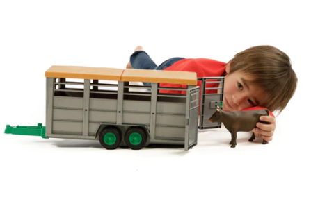 En primavera, muchos animales de granja son transportados a las praderas donde pasan el verano. Para ello, los agricultores utilizan remolques de ganado especiales con el fin de transportar cuidadosamente a sus animales en forma segura y accesible. Hay un remolque de transporte versátil similar como novedad en la gama de BRUDER. En nuestro modelo en escala 1:16, la plataforma puede bajarse como en el remolque original para facilitar la carga de los animales. Además, el modelo está equipado con una compuerta separadora. Las lonas y las puertas se pueden abrir fácilmente y el remolque puede combinarse con todos los tractores y vehículos con acoplamiento de remolque estándar, el remolque ofrece espacio para 6 animales.