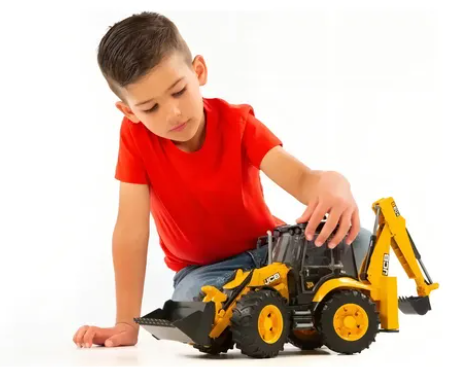 La retroexcavadora JCB 5CX ECO es un verdadero multitalento. Además de la pala frontal basculante que se puede bloquear e intercambiar, posee una excavadora trasera totalmente funcional que estabiliza el vehículo en funcionamiento mediante dos soportes extraíbles y es capaz entonces de realizar todo tipo de tareas de excavación. El brazo de cargador frontal funciona mediante el manejo con una sola mano y dispone para descargar de un botón de desbloqueo de fácil acceso. Para que los obreros disponibles en BRUDER puedan controlar todas las funciones de la retroexcavadora, el asiento del conductor es giratorio y la luneta trasera se puede abrir. Incluso aunque el obrero se haya montado por una de las puertas laterales que se pueden abrir y se haya sentado, la JCB se puede manejar sin problemas a través del techo corredizo con la barra de dirección adicional. Gracias a la dirección a las 4 ruedas, además se puede conseguir un círculo de viraje más estrecho. A fin de poder trabajar en casi cualquier terreno, la retroexcavadora JCB 5CX ECO dispone, además de los neumáticos perfilados, también de un eje delantero oscilante para cualquier tipo de terreno y, al finalizar el trabajo, la barra de dirección adicional se puede guardar en el suelo del vehículo.